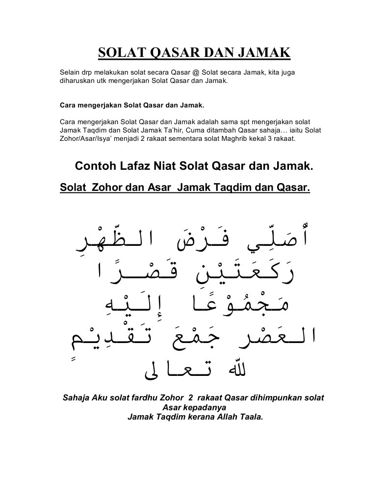Contoh Lafaz Niat Solat Qasar Dan Jamak from imgv2-2-f.scribdassets.com Contoh lafaz niat solat qasar dan jamak. Bagi yang selalu bermusafir anda mesti tahu cara solat jamak. Aku niat sholat fardu dhuhur empat rakaat yang dijamak bersama ashar fardu karena allah ta aala 2. Tata cara sholat jamak taqdim. Solat jamak disyariatkan ketika perang tabuk iaitu pada tahun 7 hijrah. Jamak takhir dan di qasarkan (dipendekkan) 1. For more information and source, see on this link : Dari pagi saya bermusafir ( keluar dari s.alam) dan melakukan sembahyang jamak zohor dan asar ….
